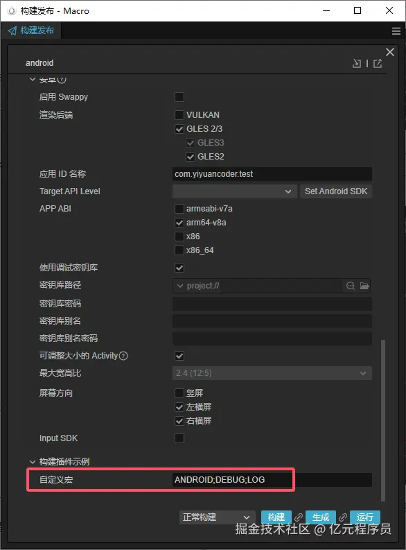 新建 android平台,自定义宏中输入ANDROID;DEBUG;LOG。
