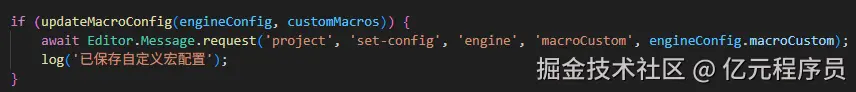 await Editor.Message.request('project', 'set-config', 'engine', 'macroCustom', engineConfig.macroCustom);消息进行保存。