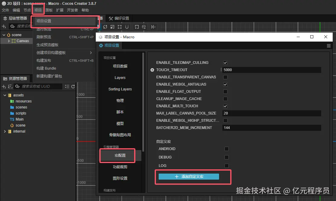 Creator 中的宏定义可以通过菜单项目->项目设置->宏配置打开面板进行编辑(CRUD)。