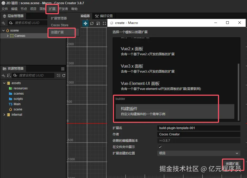 首先 要创建我们的插件,通过菜单扩展->创建扩展打开扩展创建面板,选择构建插件,并且通过扩展管理器启用插件。
