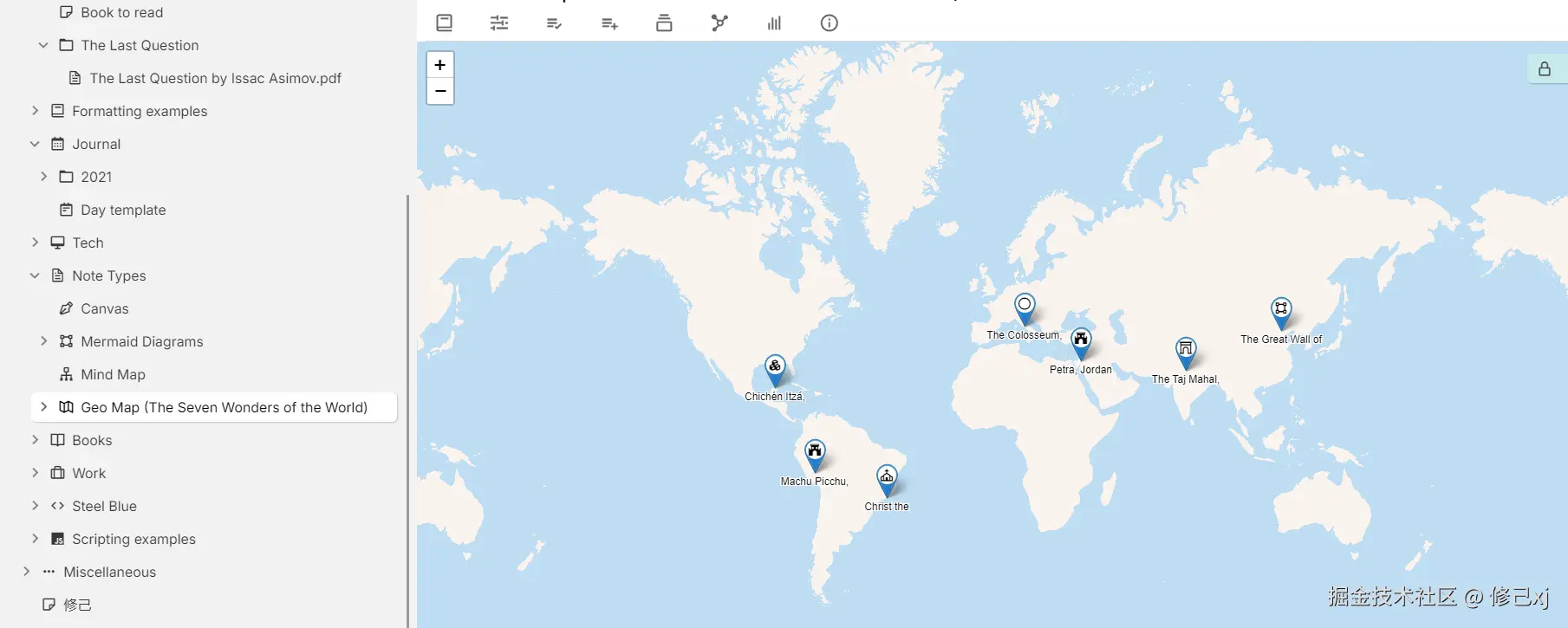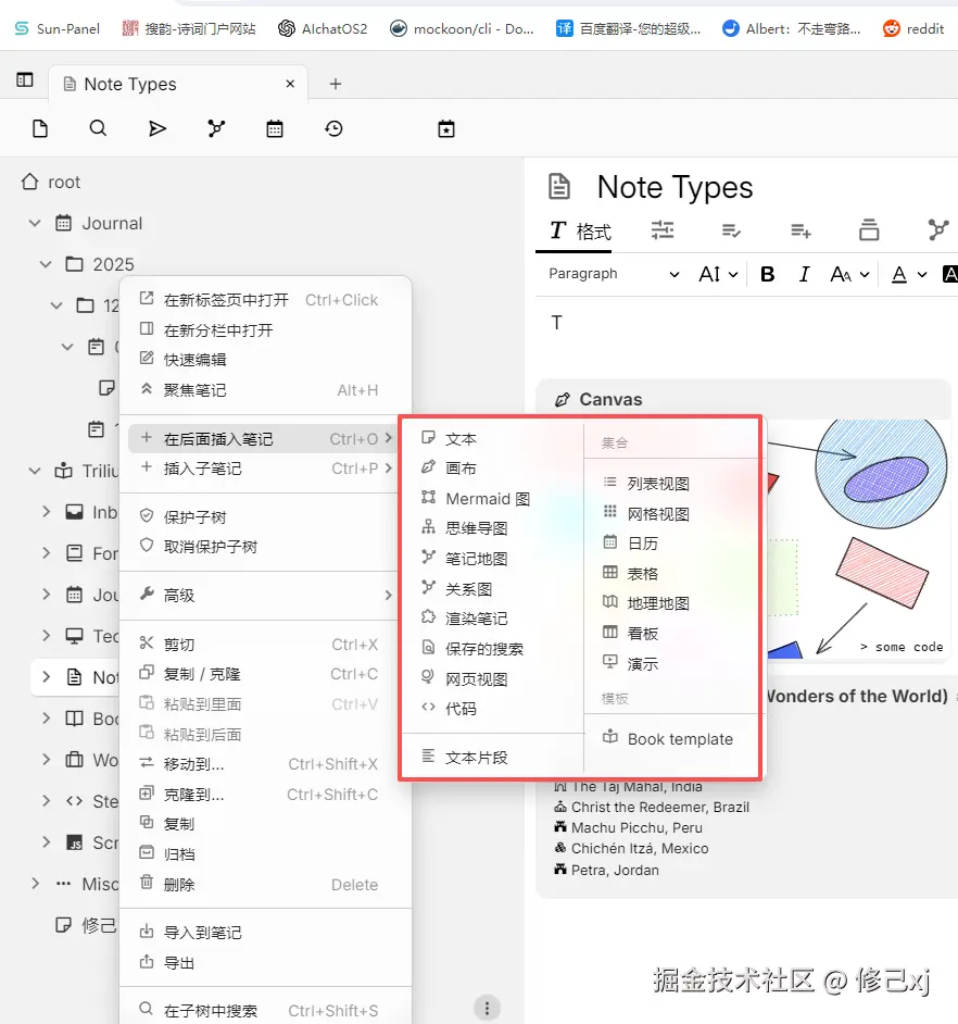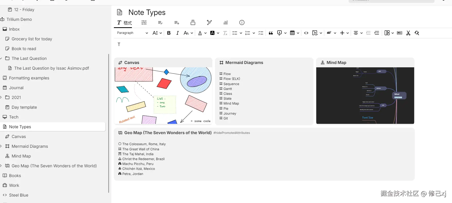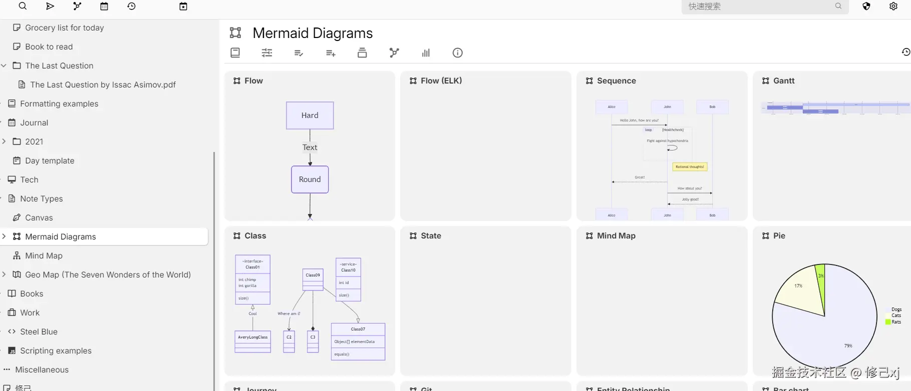 这些类型中如 Meimaid图、思维导图、笔记地图、列表视图、网格视图、日历、表格、地理地图、看板、演示 这些功能的支持还是很有特点的,我们就不在此一一做展示了。