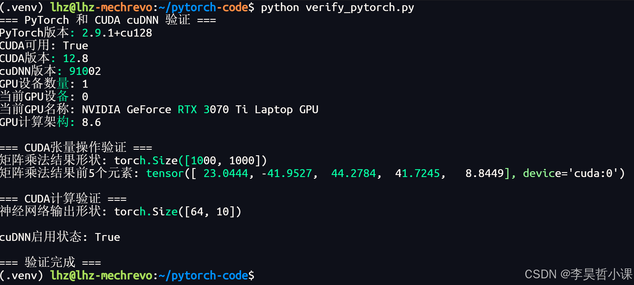 PyTorch 和 CUDA cuDNN 综合验证脚本 verify_pytorch.py