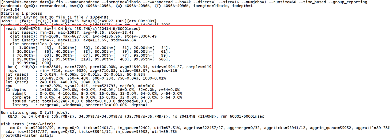 该命令会使用 4K 块大小进行随机读测试,持续 60 秒,输出吞吐量和延迟等指标。