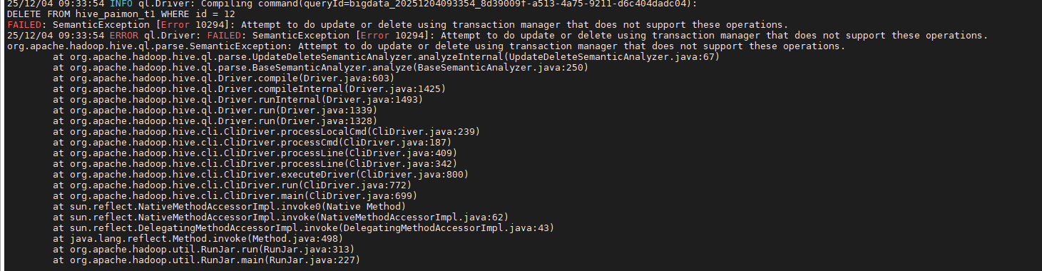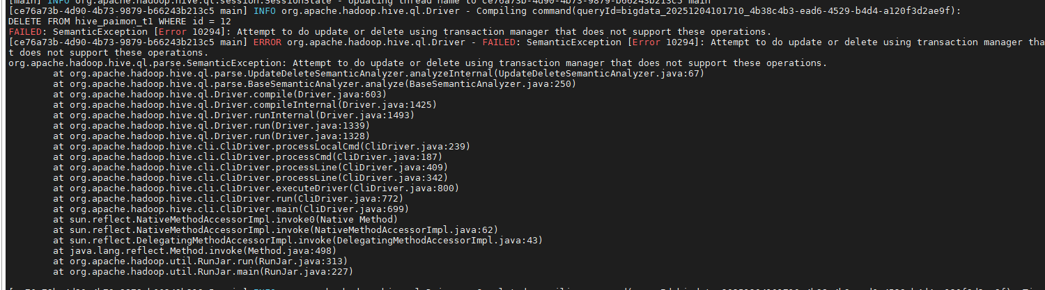 不论是客户端节点还是集群节点都出现了同样的报错。根本原因是Hive 在 CDH6.3.2 里默认使用「非事务」表(或虽然表属性里写了 transactional=true,但底层事务管理器仍然是org.apache.hadoop.hive.ql.lockmgr.DummyTxnManager)。