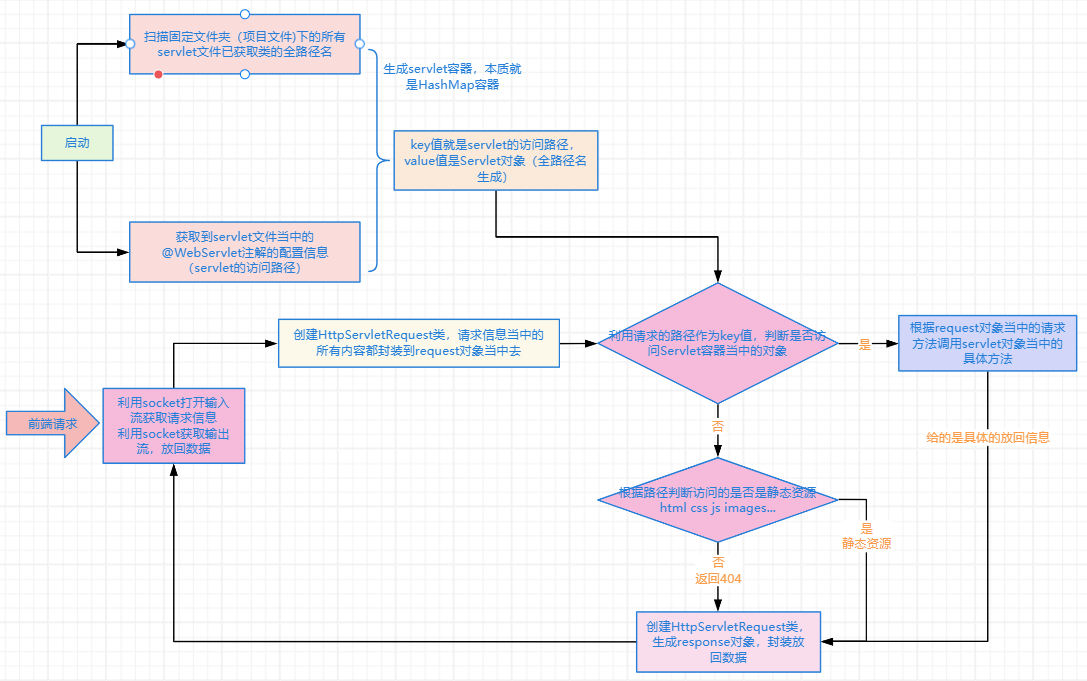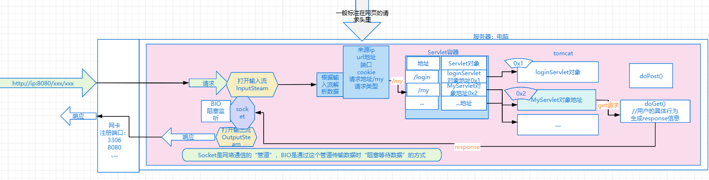 接收前端请求利用 Socket 打开输入流,获取请求信息;处理完成后通过输出流返回响应。