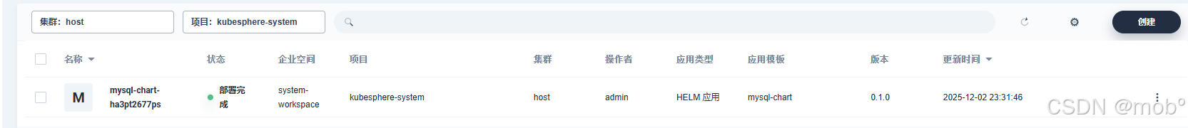登录 kubeSphere,点击 [ 企业空间管理 ] -> [ 选择我们要安装的集群 ] -> [ 应用负载 ] -> [ 应用 ] -> [ 创建 ],选择从应用模板创建,选择我们前面创建的 harbor 应用仓库。