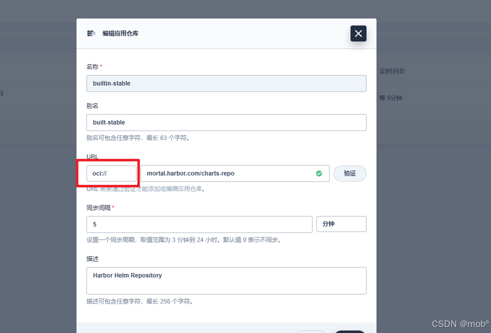 所以我们添加 harbor 为应用仓库时,需要设置 OIC://,而不是 http:// 或 https://。如下: