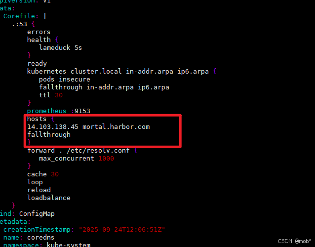 其中的域名 mortal.harbor.com 需要配置在coredns 中,不然会报: