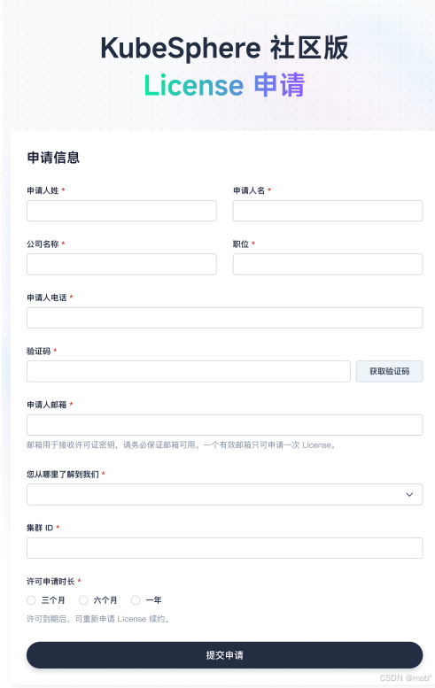 申请 KubeSphere 社区版的免费许可。填入个人信息和集群 ID,提交申请。