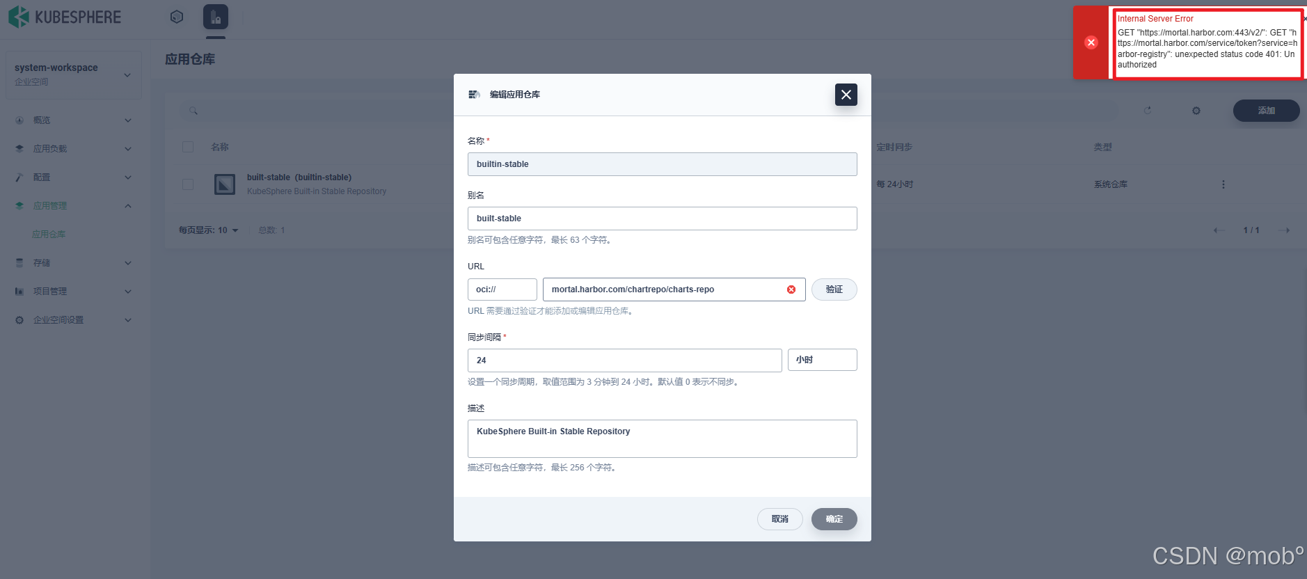 spec.url:替换为 https://mortal.harbor.com/chartrepo/charts-repo;`spec.credential`:添加认证信息(如果该字段不存在,则添加;如果存在,则更新)java# Please edit the object below. Lines beginning with a '#' will be ignored, # and an empty file will abort the edit. If an error occurs while saving this file will be # reopened with the relevant failures. # apiVersion: application.kubesphere.io/v2 kind: Repo metadata: annotations: kubesphere.io/alias-name: built-stable kubesphere.io/sync-timestamp: "1764660162" creationTimestamp: "2025-12-02T01:17:35Z" generation: 2 labels: app.kubernetes.io/managed-by: Helm application.kubesphere.io/sync-app-store: "true" kubesphere.io/workspace: system-workspace name: builtin-stable resourceVersion: "11196151" uid: 1a4cffaf-39ab-43d3-8a0e-2f0e9b6ff978 spec: credential: password: Harbor131413 username: admin description: Harbor Helm Repository syncPeriod: 300 url: oci://mortal.harbor.com/charts-repo status: lastUpdateTime: "2025-12-02T12:56:39Z" state: successful