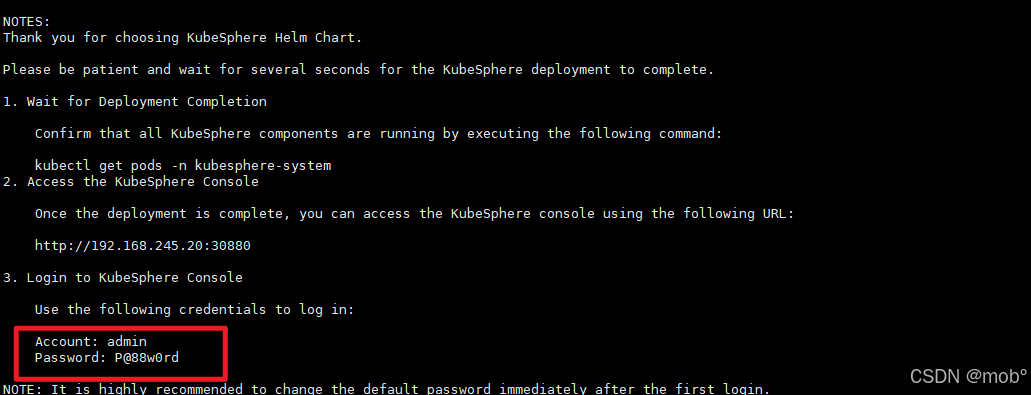 安装 KubeSphere 的核心组件:KubeSphere Core (ks-core) 。KubeSphere Core 安装完成后,即可访问 KubeSphere Web 控制台。