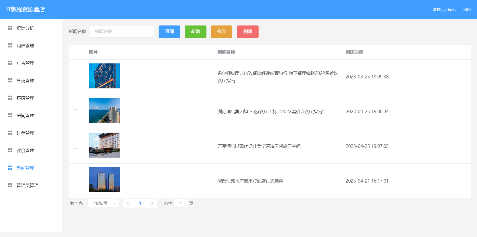 4、广告管理模块:管理员可以对酒店广告进行新增修改删除。