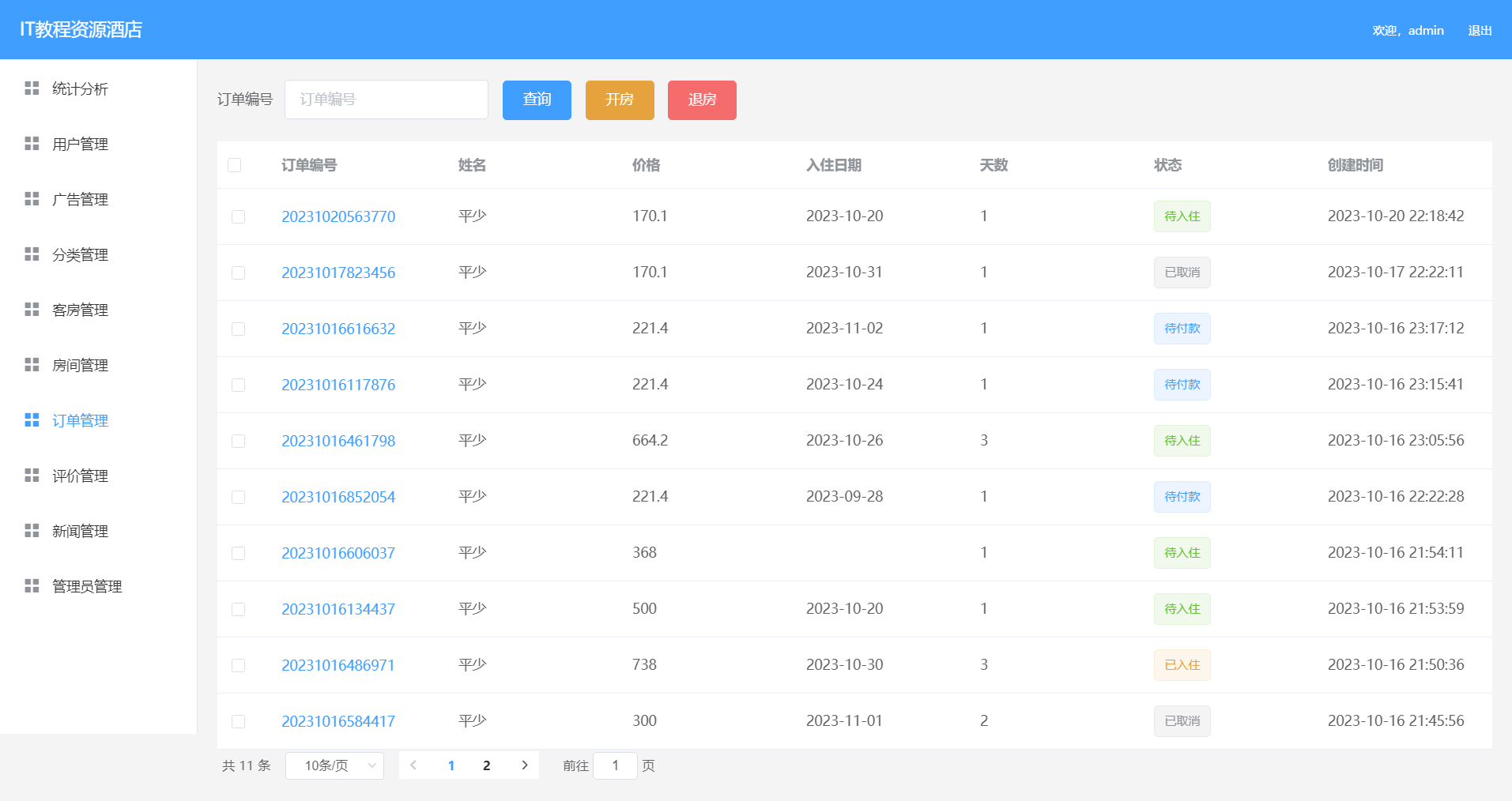 8、订单管理模块:管理员可以找到用户提交的预订信息并进行开房和退房、查看的操作。