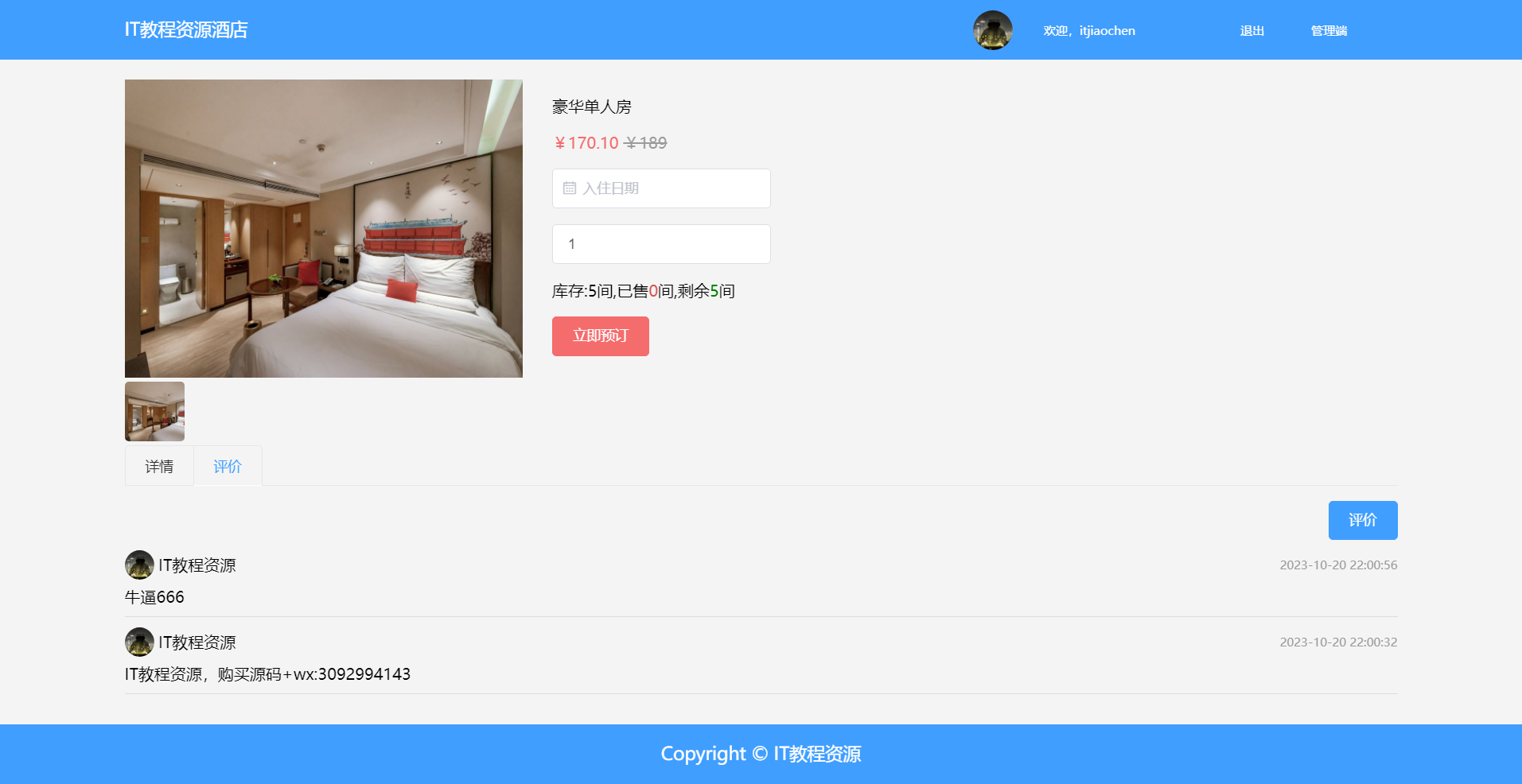 5、酒店预订模块:展示了客房的详情以及评价,用户输入入住日期以及入住天数进行预订。