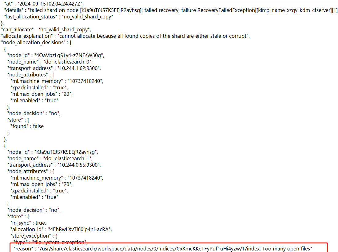 bashGET _cluster/allocation/explain返回结果中包含关键字"Too many open files"