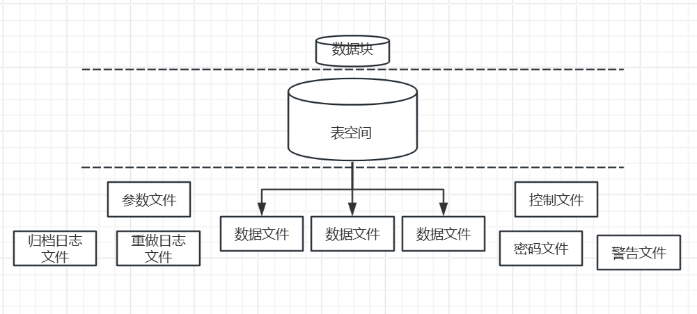 Oracle数据库的物理存储结构有多重文件组成,主要有数据文件、控制文件、重做日志文件、归档日志文件、参数文件、密码文件和警告日志文件等,如下图: