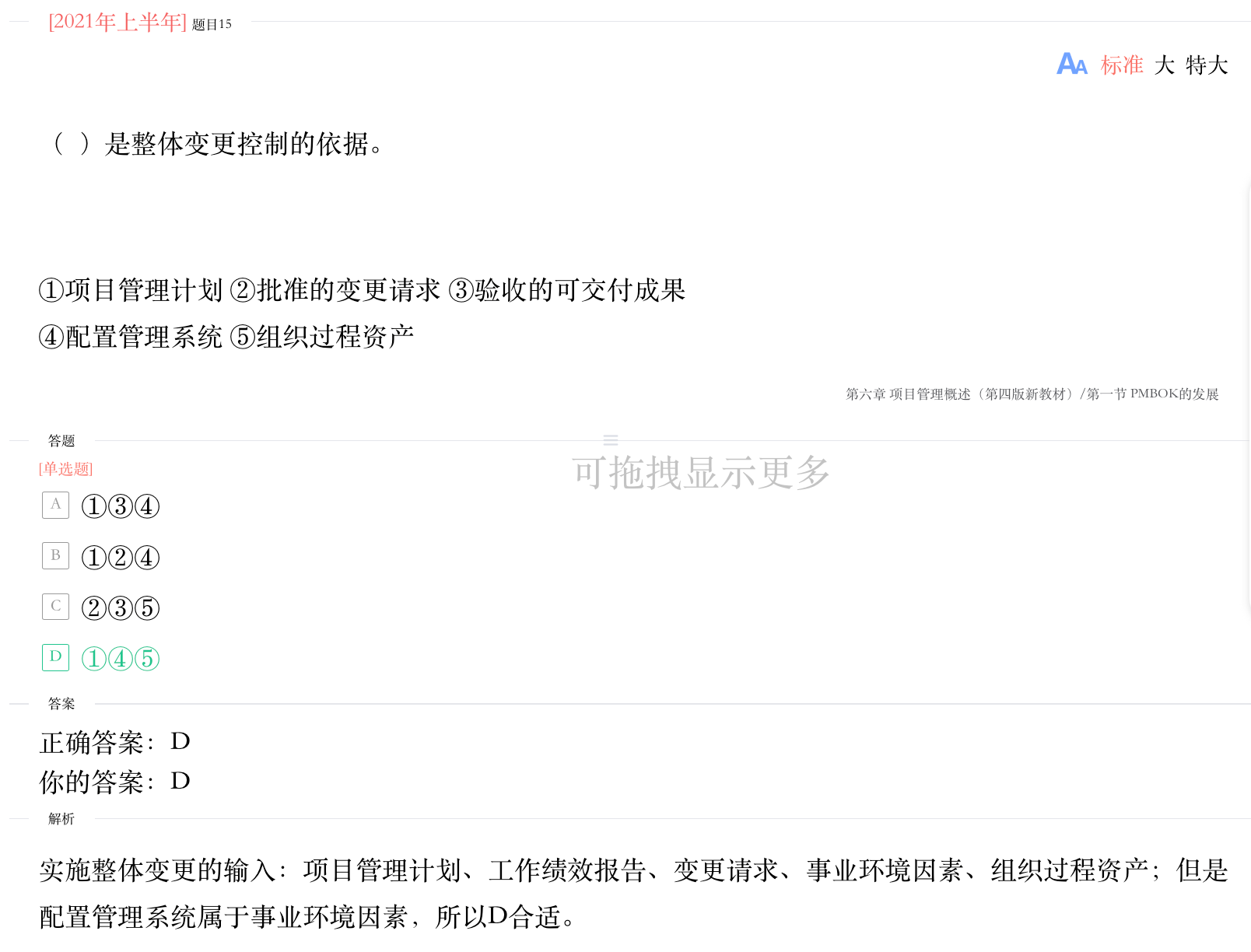 理由:配置管理系统是组织提供的一种工具或软件环境,用于记录和管理变更。在PMBOK体系中,现有的设施、软件、系统通常被归类为 事业环境因素 (EEF)。事业环境因素是所有管理过程的通用输入。