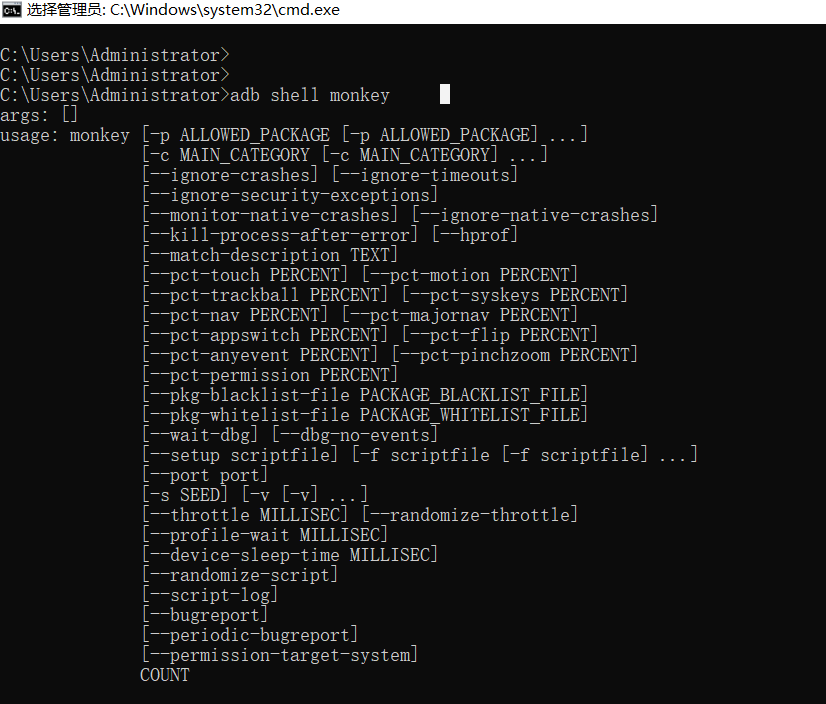 adb shell monkey -p com.ss.android.article.news -p com.ss.android.ugc.aweme --throttle 300 -v -v 100 >C:\Users\Administrator\Desktop\日志文件\monkey.txt