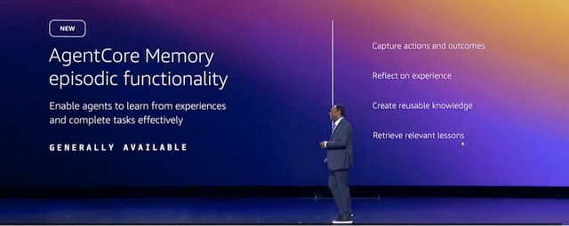 "在越交互越智能的Agent趋势下,很多AI Agent记忆能力有着明显短板。"Swami Sivasubramanian博士介绍道。为此,亚马逊云科技在Amazon Bedrock AgentCore中推出了episodic 记忆功能,使Agent能够从过往经验中学习,并将这些信息应用于后续交互。