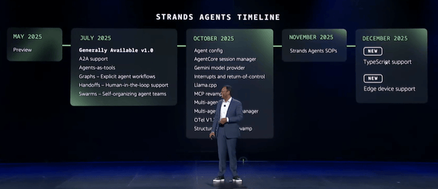 在本次大会上,亚马逊云科技宣布在Strands Agent框架中引入TypeScript 编程语言和对 Edge(边缘设备) 的支持。