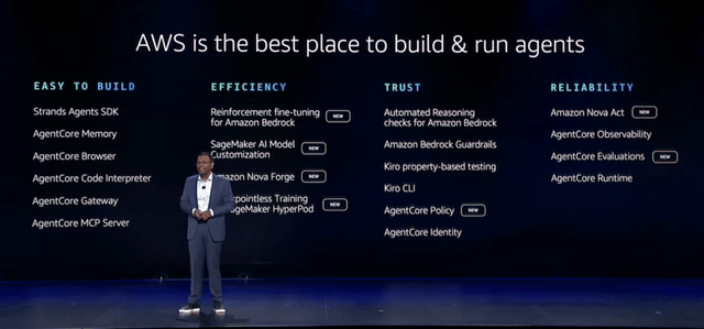 在本次大会上,亚马逊云科技又更新包括Amazon Bedrock AgentCore、Amazon Strands Agent、Amazon SageMaker AI、Amazon Bedrock RFT 、Kiro Powers等更多项功能,进一步帮助企业用户屏蔽复杂性,加速AI Agent在生产环境的价值创造。