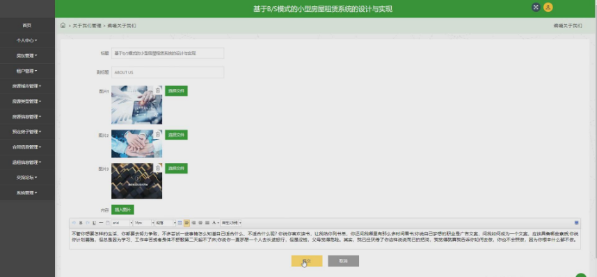 随着计算机技术发展,计算机系统的应用已延伸到社会的各个领域,大量基于网络的广泛应用给生活带来了十分的便利。所以把小型房屋租赁与现在网络相结合,利用计算机搭建小型房屋租赁系统,实现小型房屋租赁的信息化。 最后对系统进行相应的测试,测试系统有无存在问题以及测试用户权限来优化系统,最后系统达到预期目标。