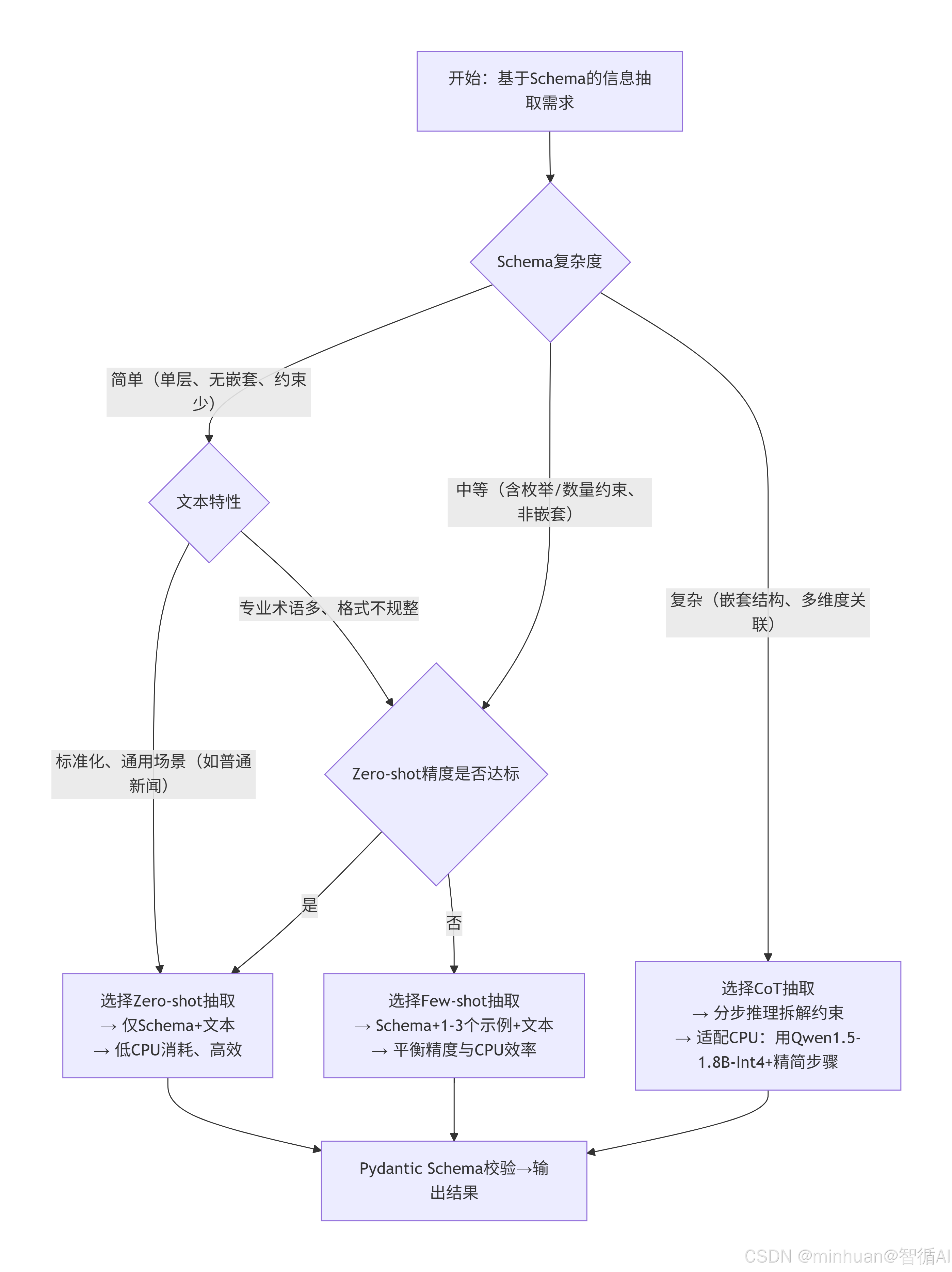 - CoT将复杂嵌套 Schema 拆解为 "信息识别→字段匹配→校验整合" 步骤,强制模型分步推理,精度最高,可处理多维度关联的 Schema,但 Prompt 最长、推理耗时久,CPU 占用高。