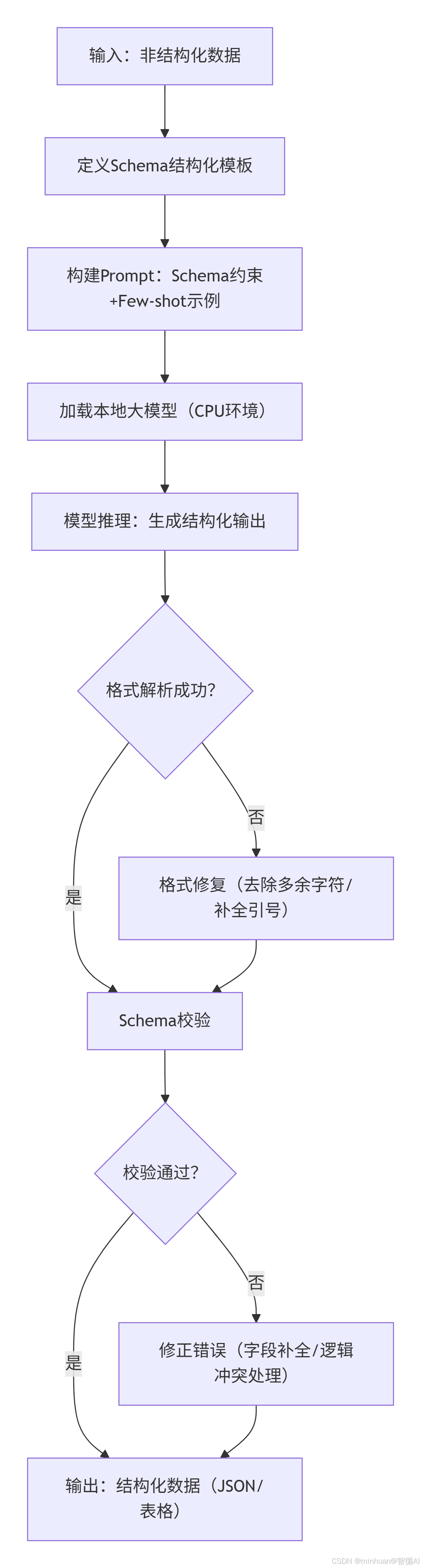 - **格式对齐与校验:**大模型根据 Schema 要求输出结构化结果,结合后处理逻辑(格式校验、冲突修正)确保数据准确性。