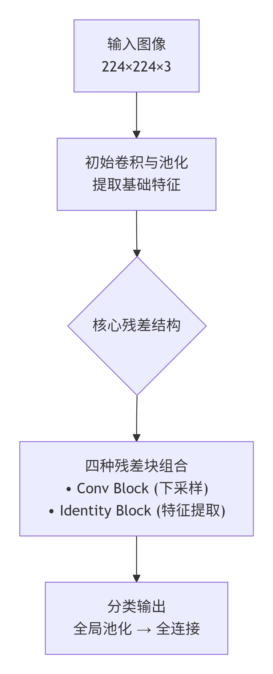 - 块级堆叠:整个网络由4种不同结构的残差块(Conv Block和Identity Block)按特定比例(3,4,6,3)组合而成,分别负责下采样和深度特征提取。