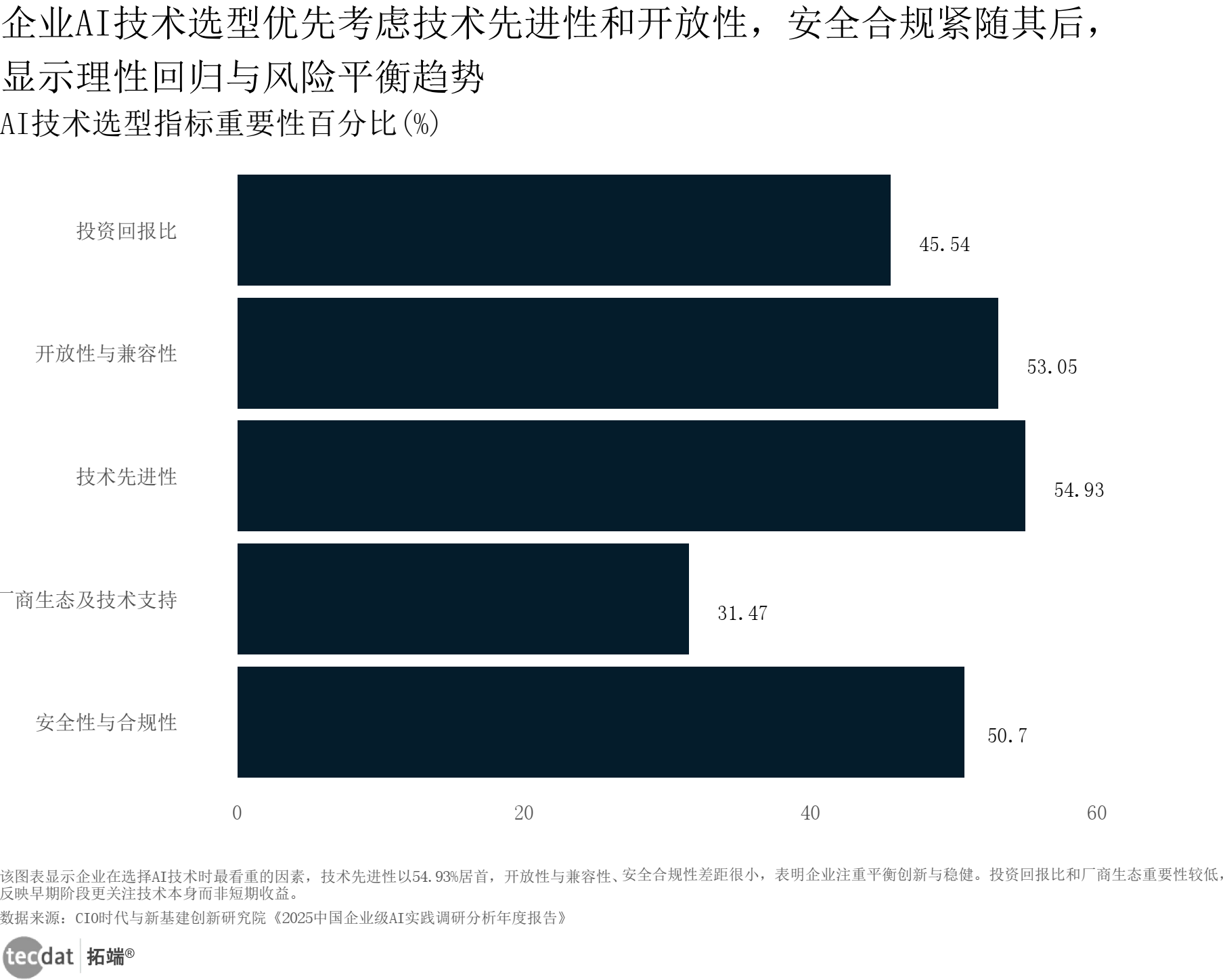 企业对AI技术的选择已形成清晰优先级。AI技术选型优先因素横向比例条形图表1 显示,"适配性"(38%)------即技术能否贴合自身业务场景(如客服效率低、生产良率差)------成为首要考量,其次是"可扩展性"(32%,未来能否支撑业务增长)和"兼容性"(22%,能否与现有系统对接),而单纯的"技术先进性"仅占8%。这一数据标志着AI选型进入"实用主义"阶段,企业更关注"能用、好用、能扩",而非"技术最前沿"。