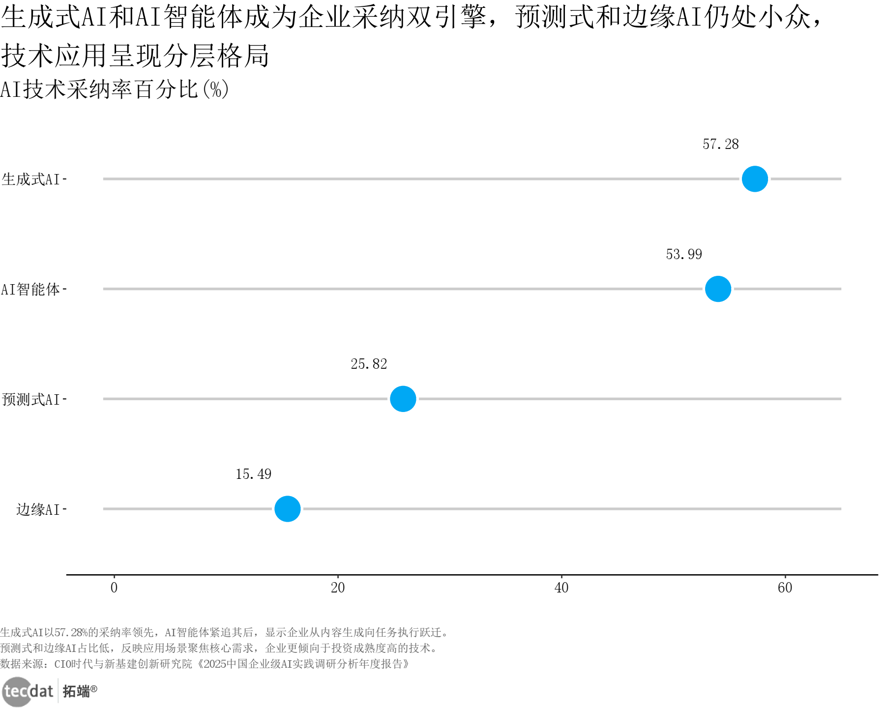 不同AI技术的落地速度呈现明显分化。AI技术采纳率刻度线图表2 显示,生成式AI(如内容创作、代码生成)和AI智能体(如自主决策、多工具协同)的采纳率分别达68%和52%,成为2025年最受青睐的方向;而复杂的物理交互类AI应用(如工业机器人自主操作、具身智能)采纳率仅23%,仍处于探索期。这种分化的核心原因是"技术成熟度与应用门槛"------生成式AI低门槛、高ROI(如AI写文案效率提升5倍),自然率先普及;物理交互类应用则受限于硬件适配、安全风险等,落地难度更高。