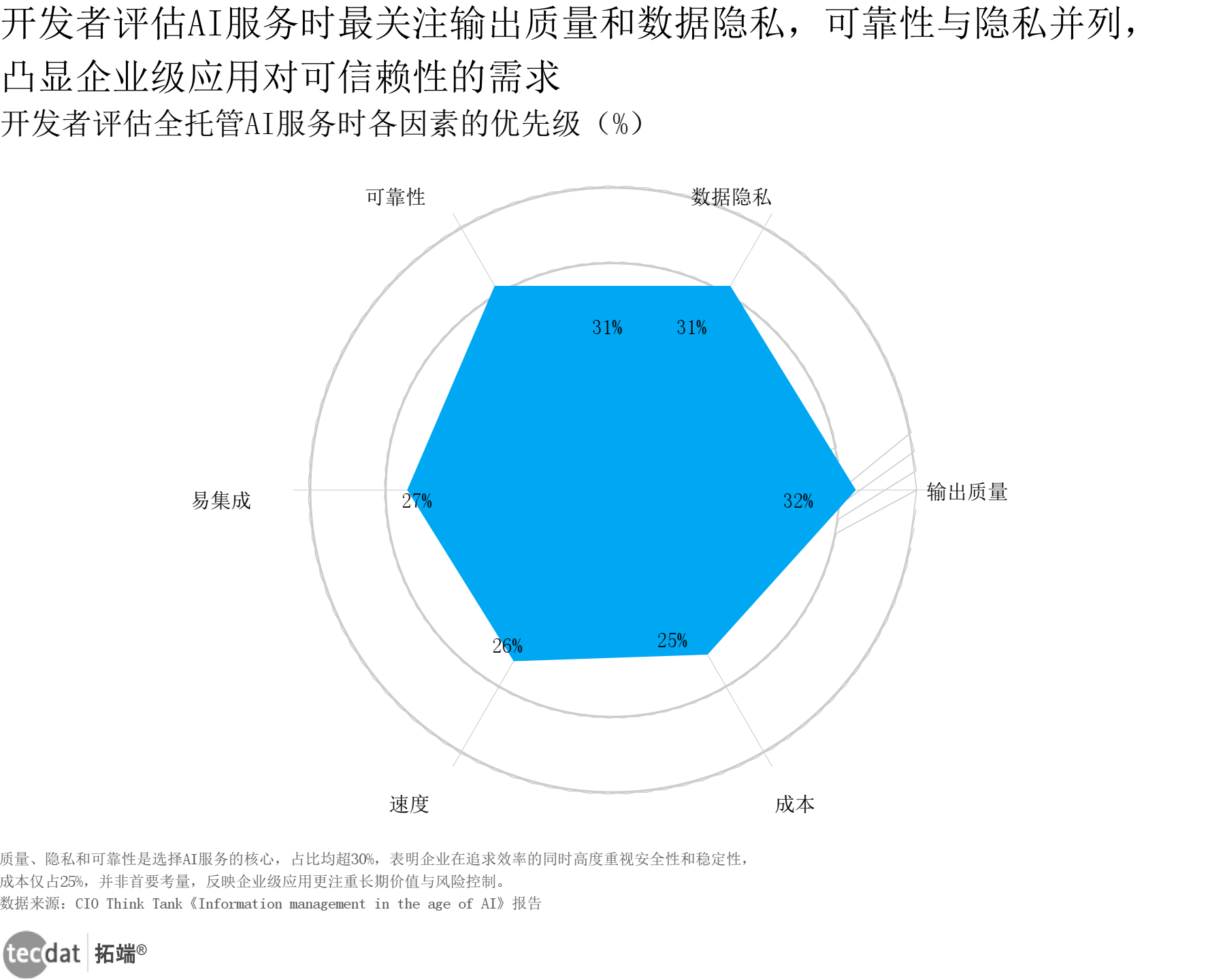 企业选择AI服务时,核心诉求已从"省钱"转向"安全可靠"。企业评估AI服务因素雷达图表9 显示,开发者评估全托管AI服务时,"输出质量"(35%,如AI生成内容的准确性)、"数据隐私"(34%,如客户数据是否加密)、"可靠性"(32%,如服务是否稳定不宕机)是Top3优先级,"成本"(25%)反而位居其后。这一变化的核心原因是:AI应用已从"试点"走向"核心业务"------比如AI用于生产排程时,一旦输出错误可能导致停工,安全与稳定自然成为不可妥协的底线。