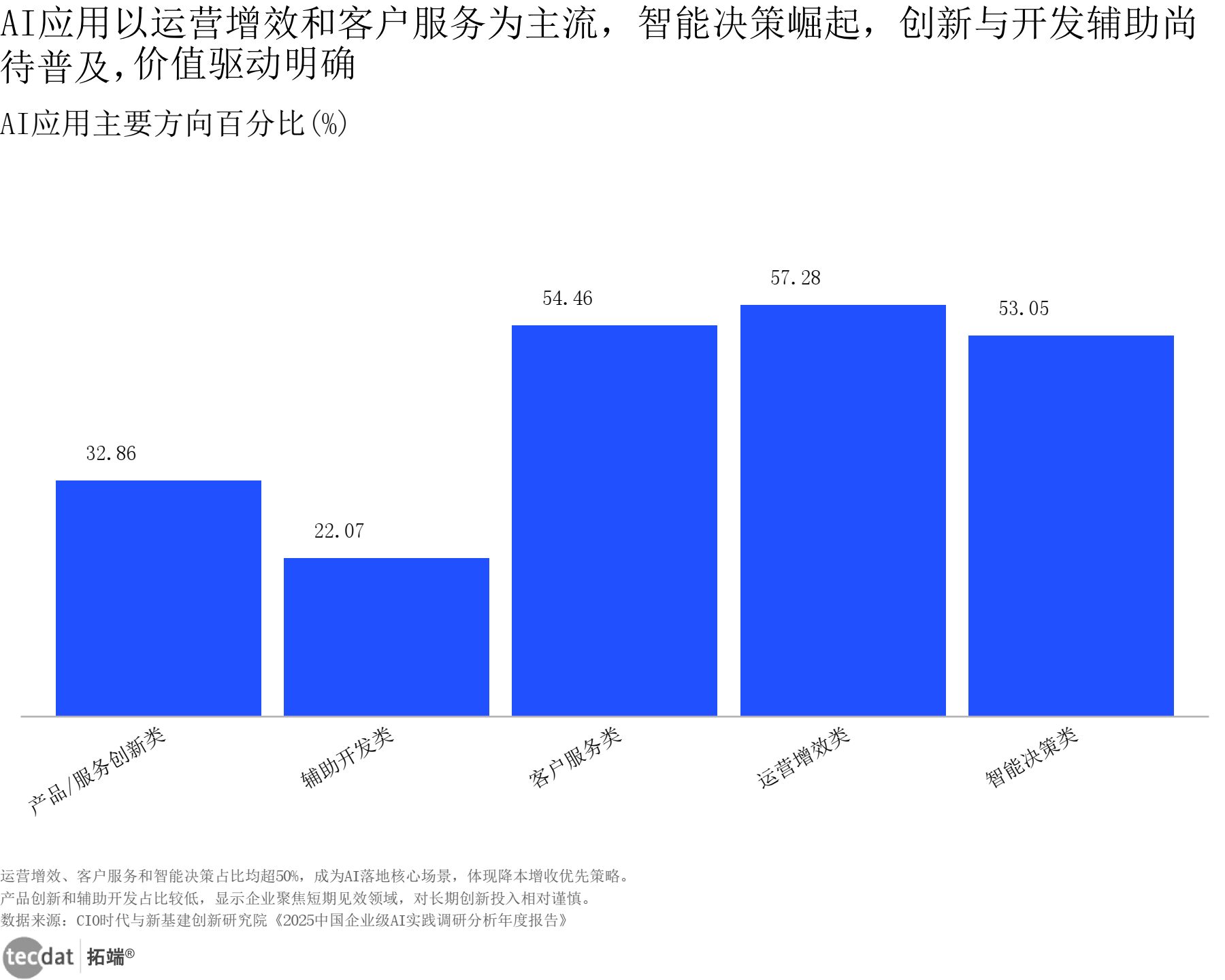 从产业应用分布看,AI应用主要方向灰底比例条形图表3 显示,AI在"效率提升"(42%)和"成本优化"(35%)场景的应用占比超七成,其次是"创新业务"(15%)和"风险控制"(8%)。具体到细分领域,客服自动化(如AI智能客服减少人工咨询)、生产排程优化(如AI调整工厂生产节奏)、营销内容生成(如AI制作短视频脚本)成为当前最主流的三大方向------这一分布契合企业"先解决生存问题(降本增效),再探索发展问题(创新业务)"的落地逻辑,避免"为AI而AI"。