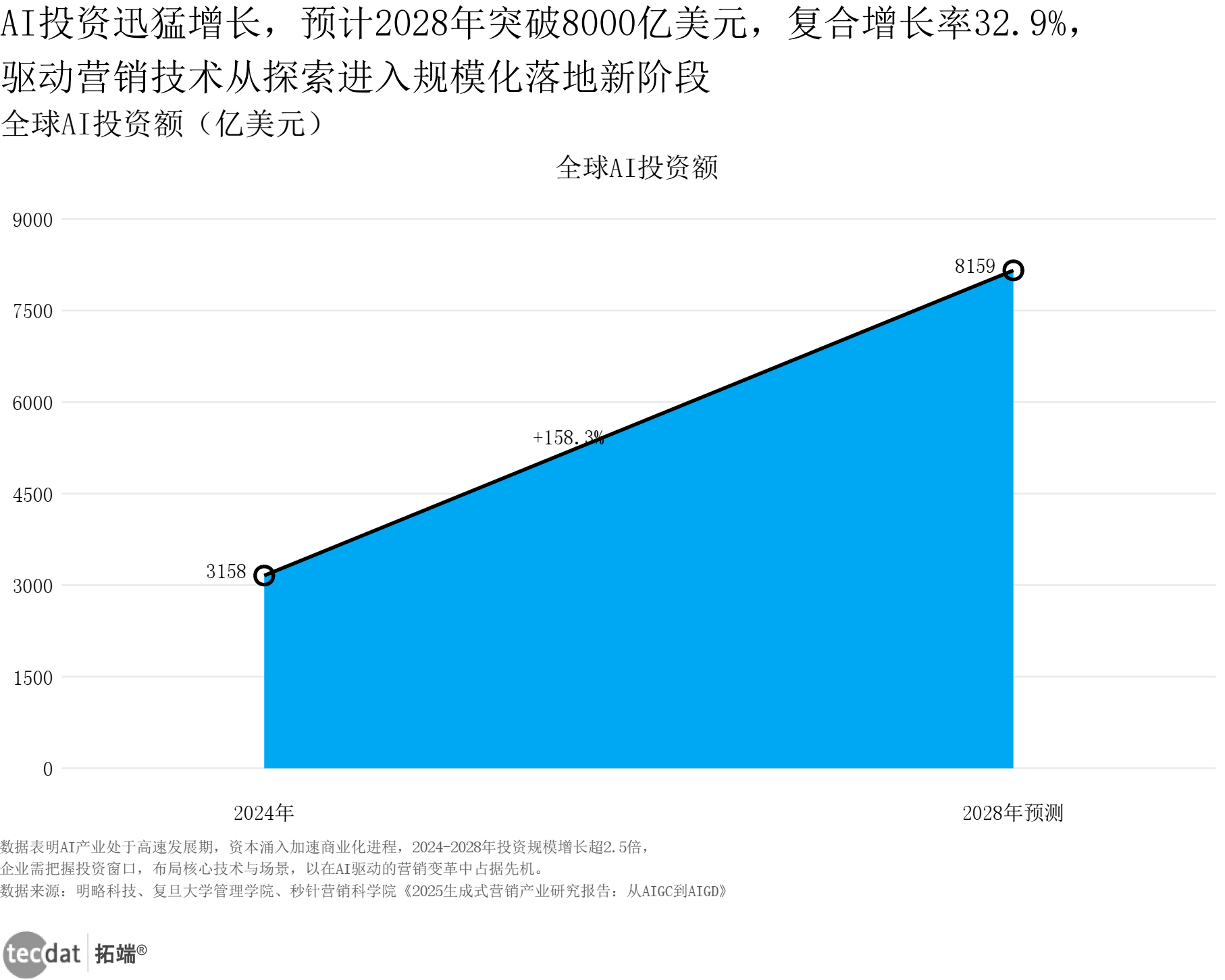 全球资本对AI的投入仍处爆发期。IDC数据显示,2024年全球人工智能IT总投资规模达3158亿美元,预计2028年将增至8159亿美元,五年复合增长率32.9%,其中生成式AI占比将达35%。全球AI投资额趋势时间增长对比多边形条形图表13 清晰呈现这一趋势:2028年投资规模较2024年增长158.3%,资本正加速向两大领域集中------一是AI基础设施(如数据中心、GPU芯片),二是垂直应用(如工业质检、营销决策、城市治理),前者是"硬支撑",后者是"价值兑现出口"。