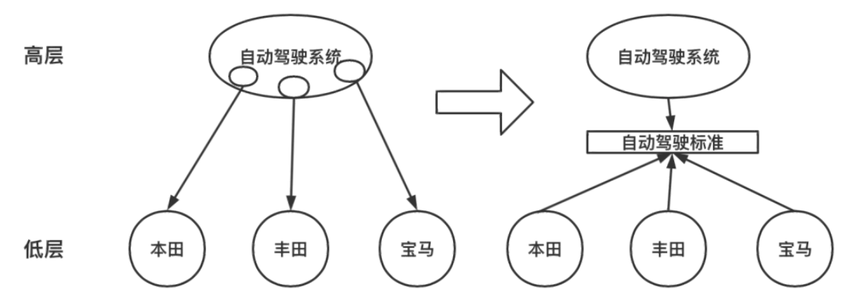 自动驾驶系统公司是高层,汽车生产厂商为低层,它们不应该互 相依赖,一方变动另一方也会跟着变动;而应该抽象一个自动驾 驶行业标准,高层和低层都依赖它;这样以来就解耦了两方的变 动;自动驾驶系统、汽车生产厂商都是具体实现,它们应该都依 赖自动驾驶行业标准(抽象);
