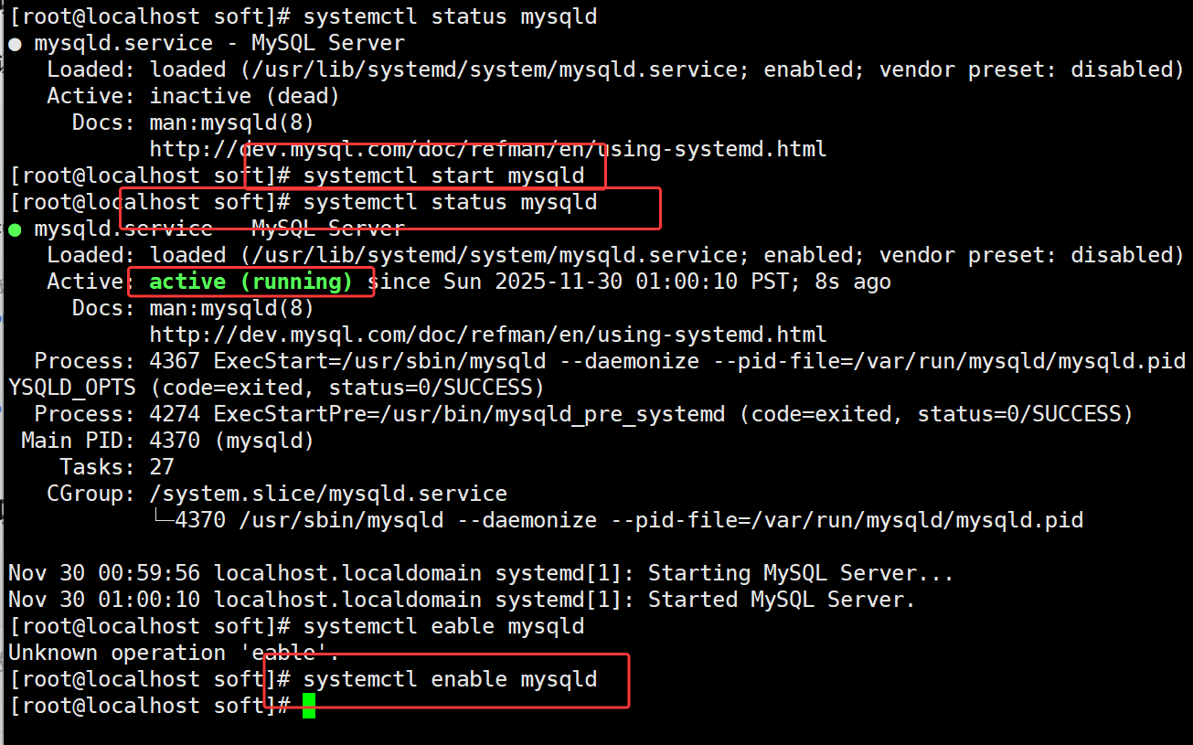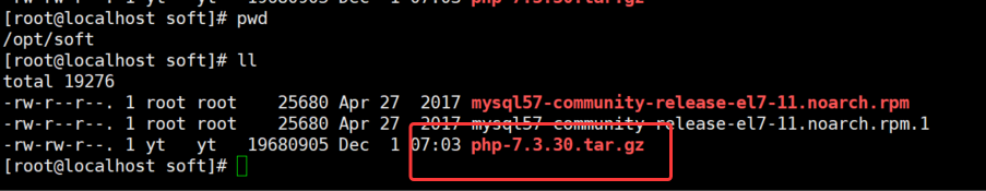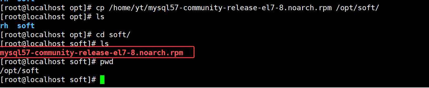 将下载的MySQL复制到新建的文件夹下,路径为/opt/soft/