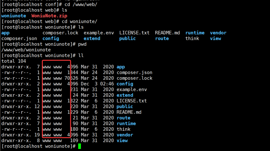 修改文件所有者:chown -R www:www woniunote #确保该目录及其所有子目录和文件均修改了文件所有者为www