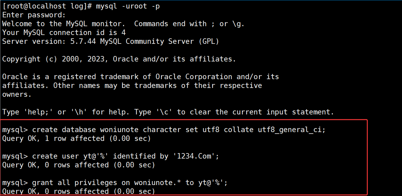 # 授权用户yt 拥有 woniunote 数据库所有权限