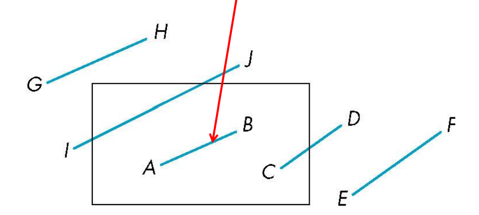 ④GH和IJ的端点在窗口外,具有相似的编码,不全是零,但逻辑与为0。这个时候可以通过与窗口一条边求交点缩短线段(如何缩短?上下右左),然后计算新端点的编码,重新执行前述算法。