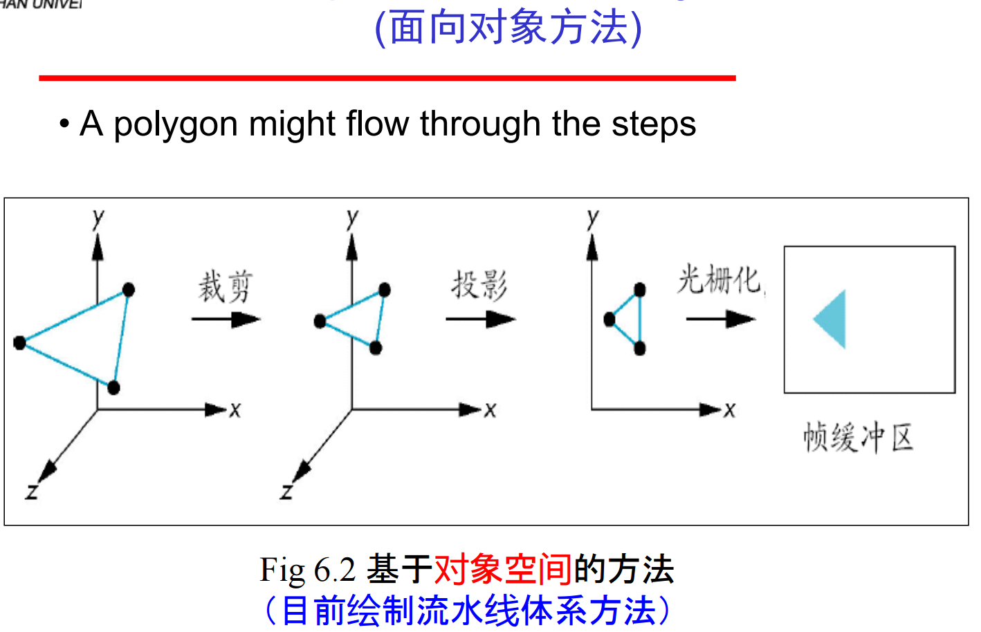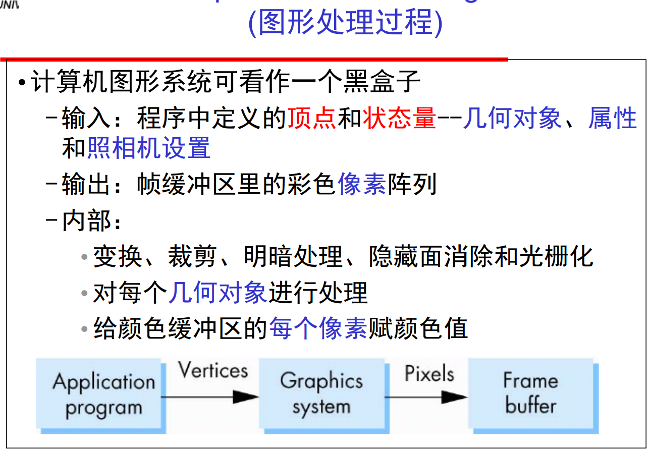 (1)投影(包括各种坐标变换)。第一步是利用模型-视图变换把几何对象从对象坐标系变换到照相机坐标系或视点坐标系;第二步是利用投影变换把顶点变换到规范化视景体(顶点表示为裁剪坐标)。