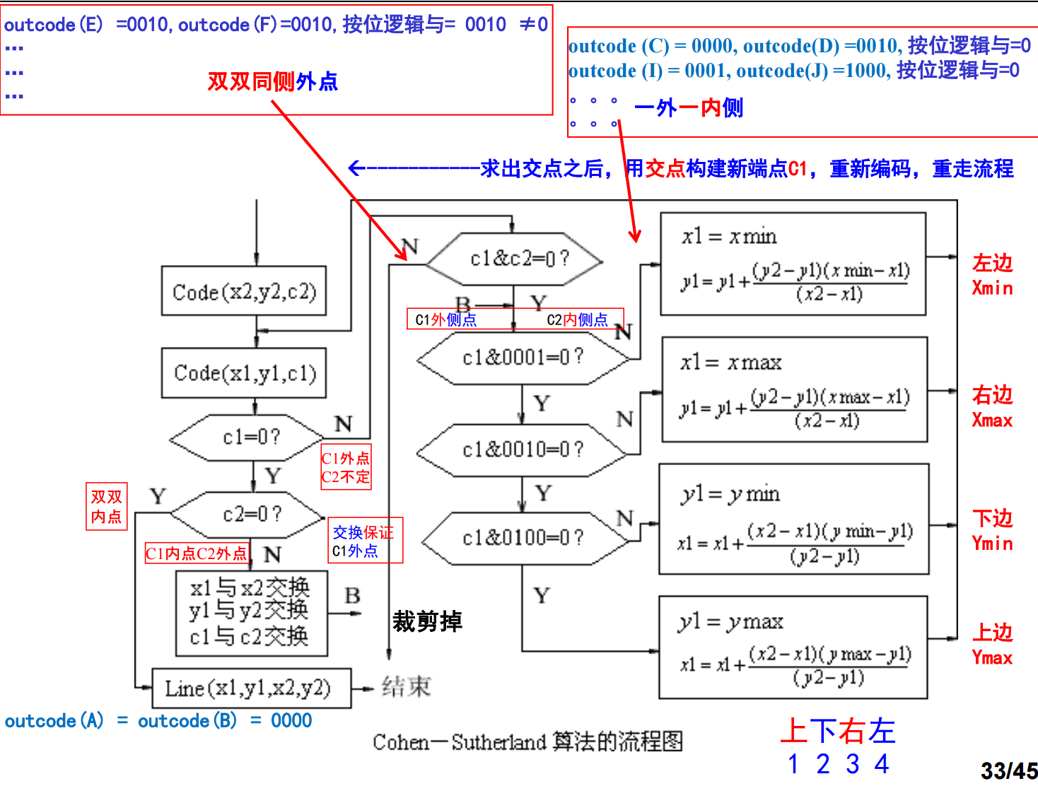 ②CD:编码(C) = 0000,编码(D) =0010≠0,在编码(D)中的1确定线段与哪条边相交(图中为右边)。如果有一条从点A出发的线段,另一端点的编码中有两个1,那么可能需要进行两次求交点(比如编码K=1010)。