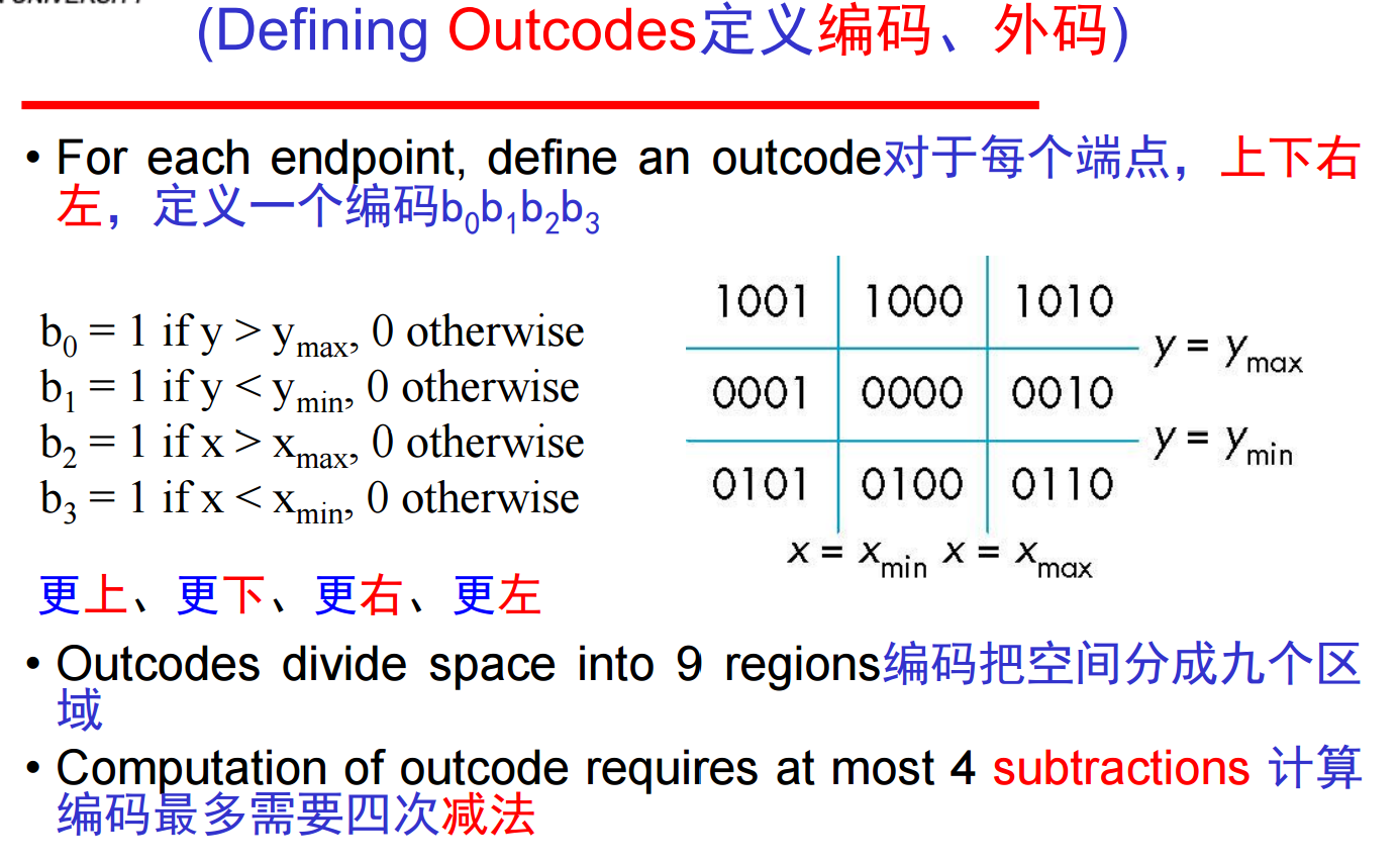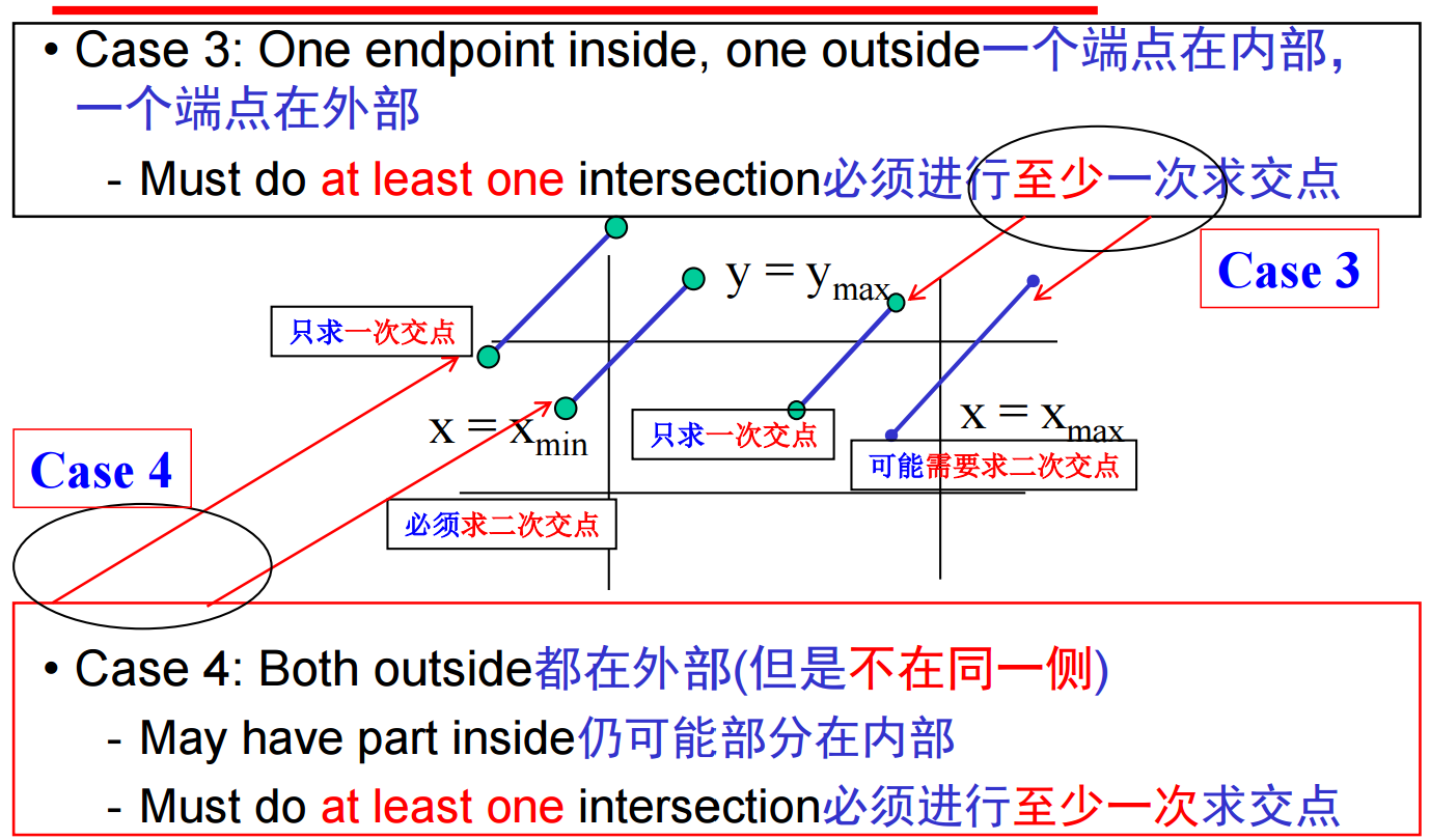 4、接下来我们具体考虑裁剪Clipping,显然有三种情形:接受/保留、拒绝/剔除、裁剪/分割。二维的相对于裁剪窗,三维的相对于裁剪体。很容易想到,裁剪对于线段和多边形很容易进行,但对于曲线和文本很难进行------将它们转化为线段和多边形即可。然后,最直观的计算办法就是计算线段与裁剪窗口边界的交点,但这很低效,因为每次求交点运算都需要一次除法。