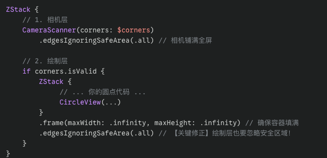绘制层:如果你的 SwiftUI 绘制层没有显式忽略安全区域,SwiftUI 默认会把 (0,0) 放在安全区域内部(刘海下方)。这导致相机认为的点 (100, 100) 在 SwiftUI 看来应该画在更靠下的位置。