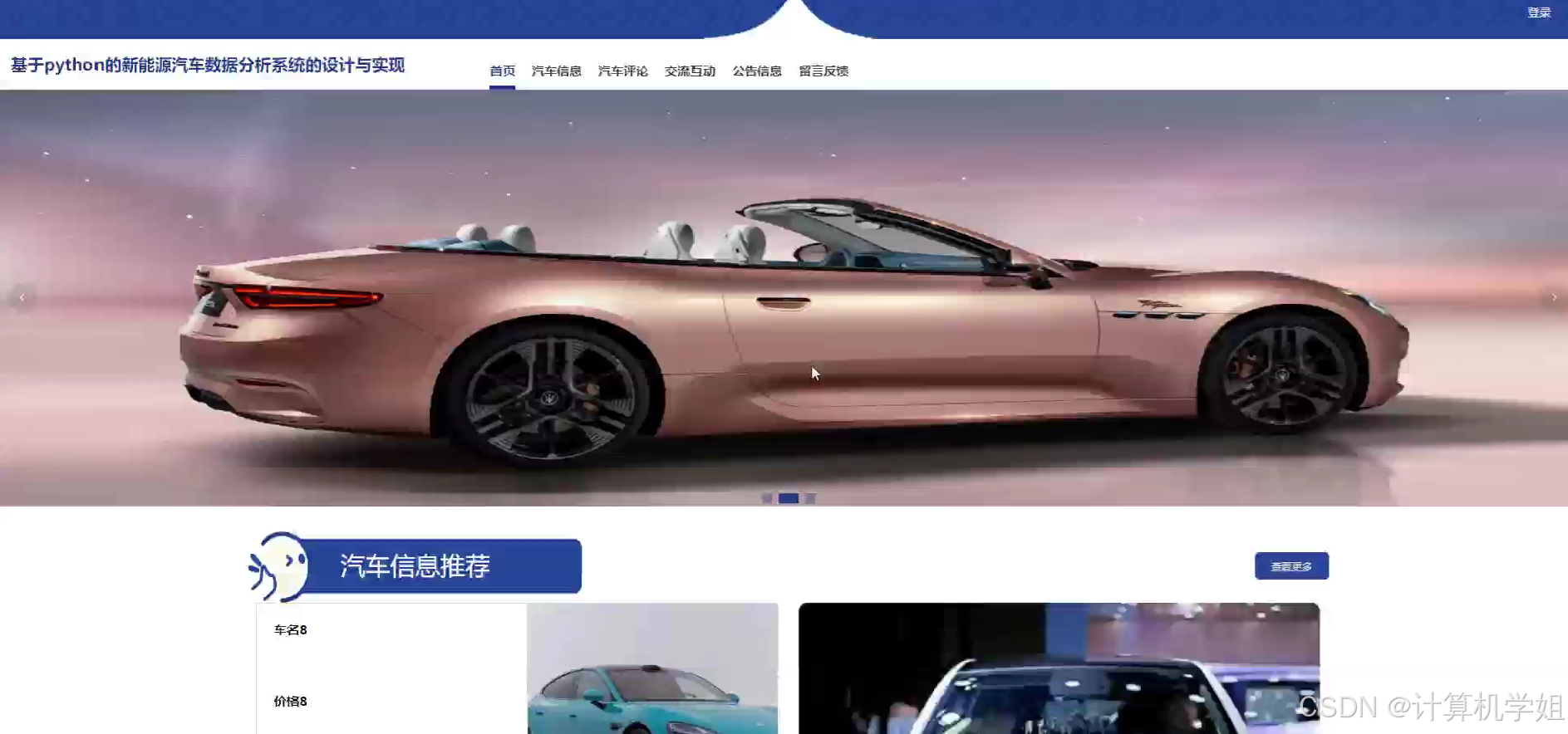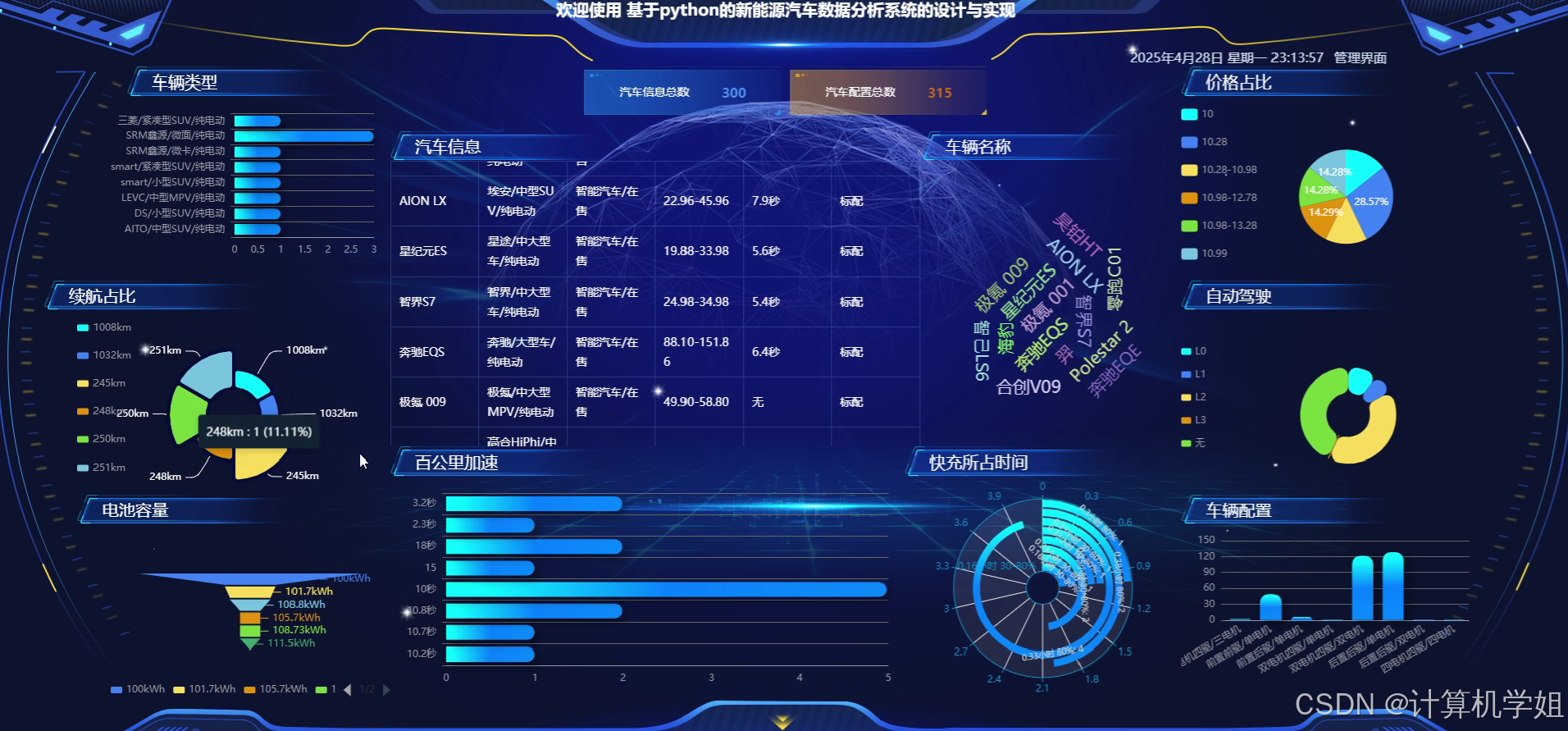 基于Python+Django+Vue+MySQL构建的新能源汽车数据可视化及分析系统,旨在整合多源异构数据资源,为行业决策提供科学支撑。系统采用前后端分离架构,以Django作为后端框架实现数据清洗、存储与业务逻辑处理,Vue框架构建交互式前端界面,MySQL数据库保障数据持久化存储。通过集成新能源汽车销售数据、用户行为数据、充电设施分布数据及政策文本数据,系统支持多维度的数据可视化展示(如销售趋势图、区域分布热力图、用户画像分析等)与基础统计分析功能(如同比环比计算、相关性分析)。研究突破传统数据展示的单向性局限,通过动态图表与交互式操作界面降低数据解读门槛,同时提供数据导出与报告生成功能,满足企业市场调研、政策制定及学术研究的多样化需求。实验结果表明,系统在百万级数据量下仍保持秒级响应速度,且可视化组件的交互延迟低于200ms,有效提升了新能源汽车数据的应用价值与决策效率。