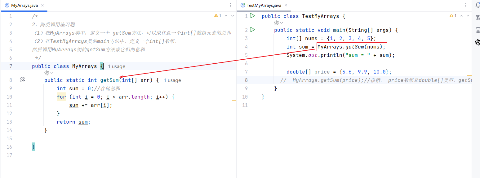 // MyArrays.getSum(price);//报错, price数组是double[]类型,getSum要的是int[]类型