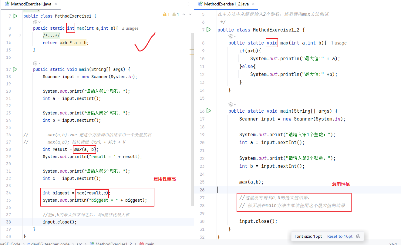- 如果被调用方法的返回值类型是void,说明没有结果返回,就不能也不需要接收返回值。如果不是void,说明有结果返回,用对应类型的变量接收返回值就可以。