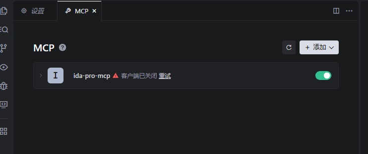 添加成功,这里显示客户端关闭,是因为ida还未开启mcp