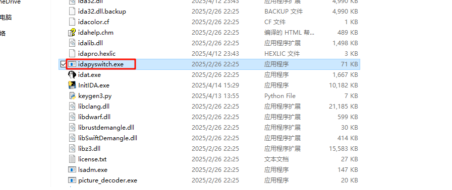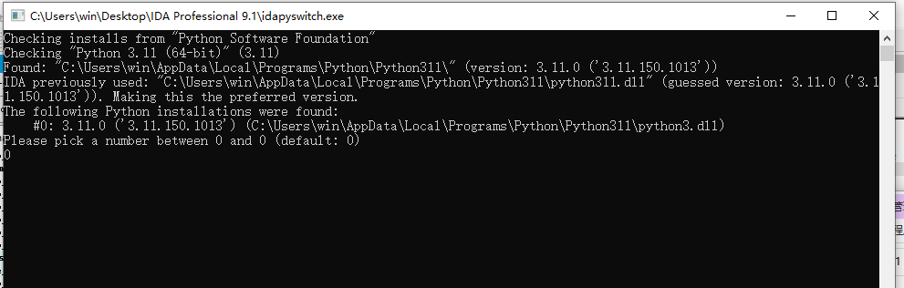 在ida的根目录找到idapyswitch.exe,他会自动识别存在的python它可以决定ida里面使用python的版本,双击打开他,选择一个python版本大于等于3.11就可以了,必须要选择一次,就算是显示只有1个python环境并且符合环境要求,也要执行一次,否则ida插件栏里面不会显示mcp