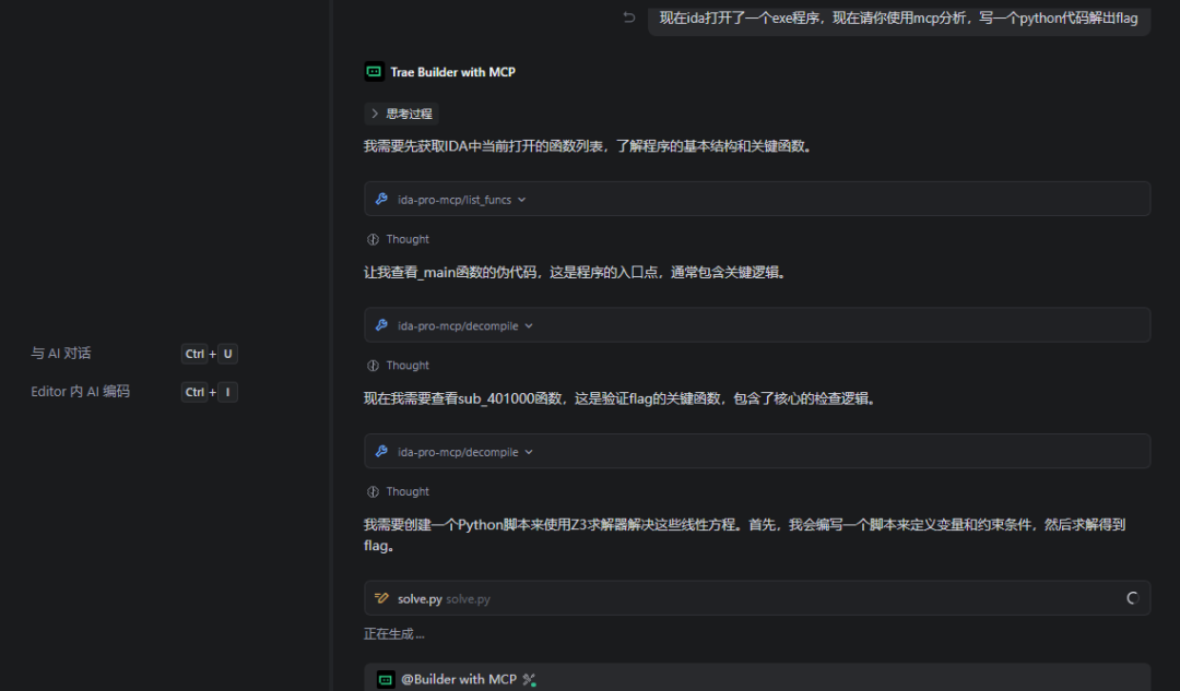 现在ida打开了一个exe程序,现在请你使用mcp分析,写一个python代码解出flag