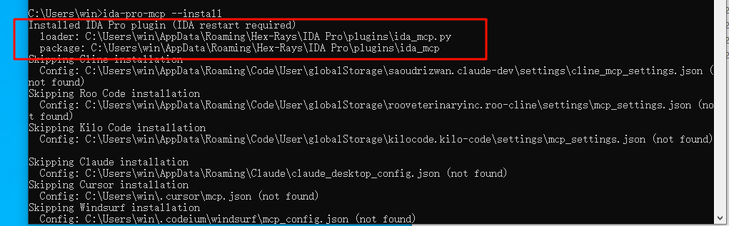 执行以下命令,将下载的MCP插件安装到IDA Pro,